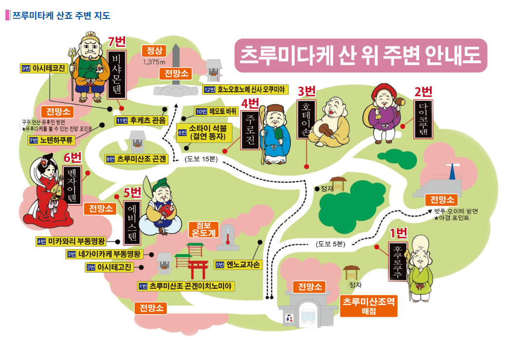 정상에 도착하면 간단한 산책로가 조성되어 있어 천천히 걸으며 자연을 만끽할 수 있습니다. 츠루미다케는 예로부터 이 지역 사람들에게 신령한 기운이 깃든 영산으로 숭상되어 산 정상 곳곳에는 신사와 많은 신불들이 있습니다. 츠루미 산 정상의 산책로를 따라 걷다보면 이 산에 모셔진 칠복신들과 사원들을 순례할 수 있습니다. 또한, 로프웨이 정류장 근처에는 기념품 가게와 작은 카페가 있어 따뜻한 커피나 차를 마시며 여유로운 시간을 보내기에 좋습니다. 벳부 로프웨이는 벳부의 자연을 한눈에 감상할 수 있는 최고의 장소로 도시의 분주함을 벗어나 힐링할 수 있는 여행지입니다.